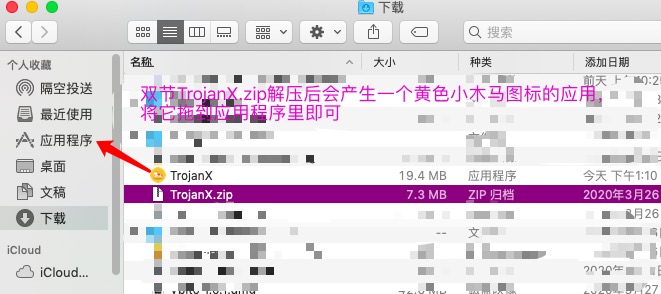 - 下载之后会在下载文件夹有一个trojanX.zip的压缩包,双击解压压缩包,解压之后会在下载文件夹里产生一个TrojanX文件名(小木马图标)的应用程序,把它移动到应用程序文件夹即可。