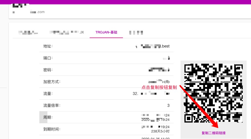 登录之后点开账号菜单即可看到trojan账号信息: