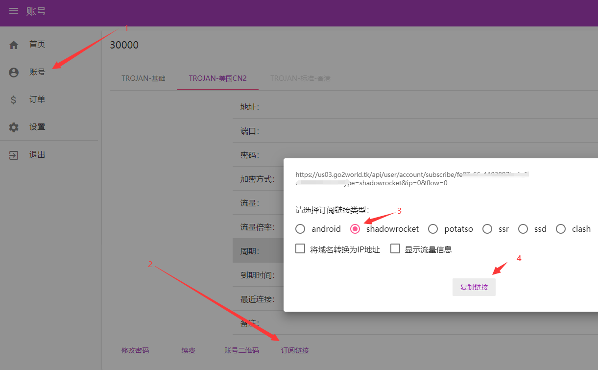 - 登录达世界官网获取订阅链接 (没有订阅链接的这里购买:Trojan节点服务提供商)