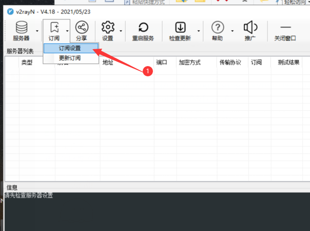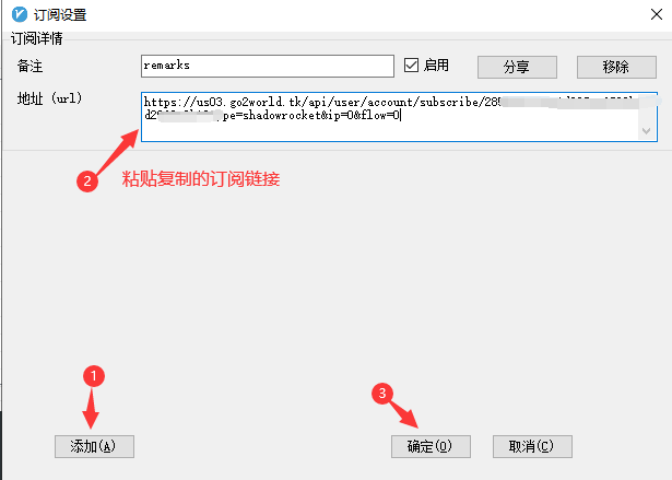 - 在第一步打开的 Trojan 设置面板里依次点开 【订阅】->【设置】->【添加】,将复制的订阅链接添加上,点击【确定】